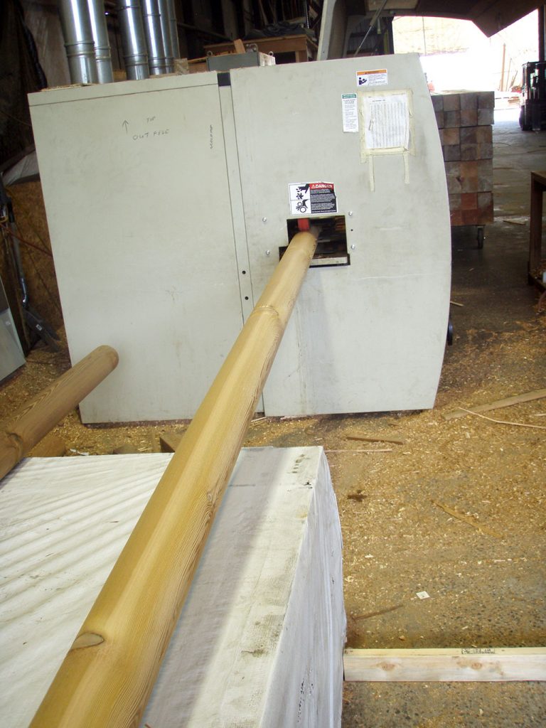 PowerWood produces round poles using several different methods. The most common is turning logs on a lathe. The logs are selected for diameter, straightness and material quality and then mounted onto an oversize lathe. They are turned and scuff sanded lightly to remove knife marks. The poles can also be fine sanded on the lathe for a smoother finish.